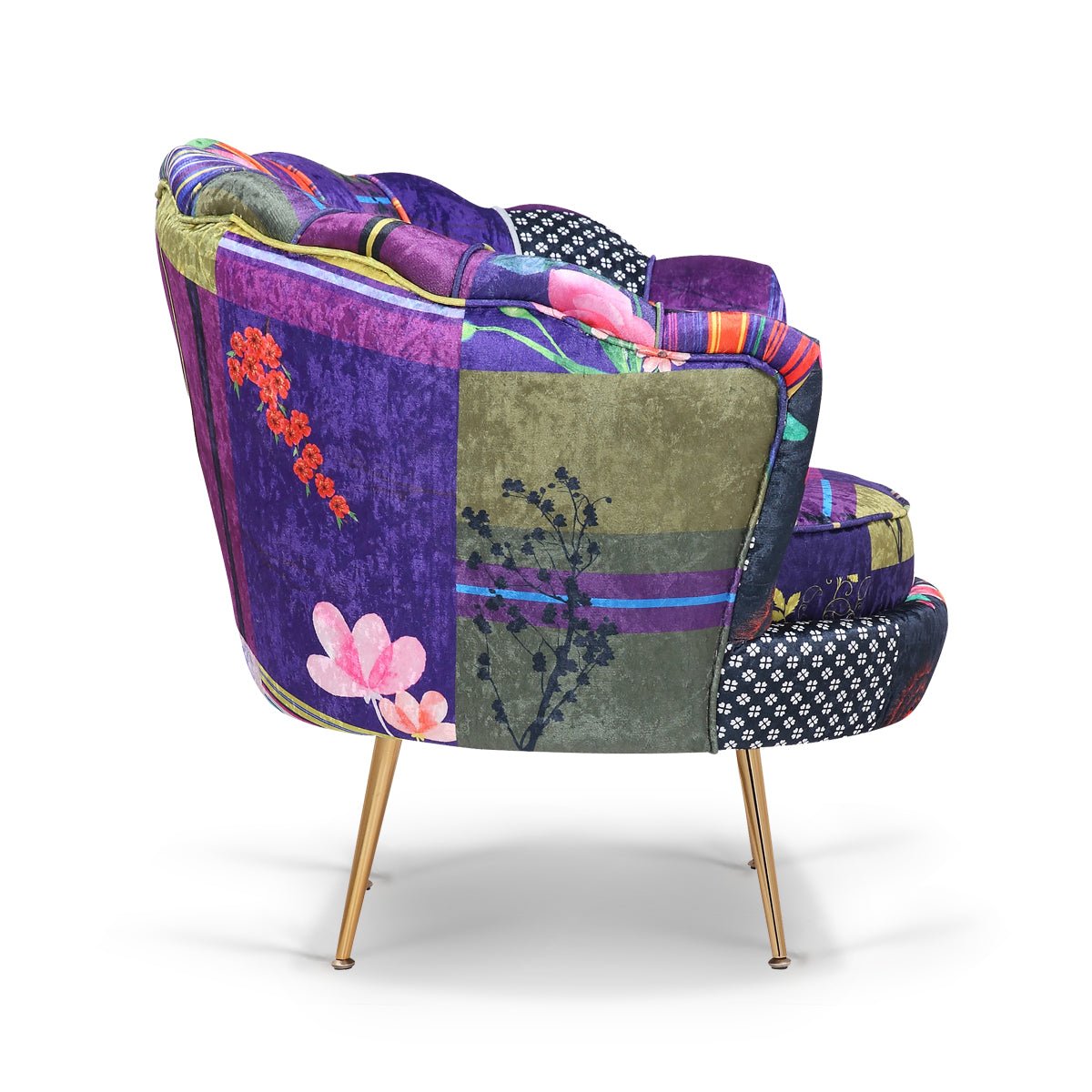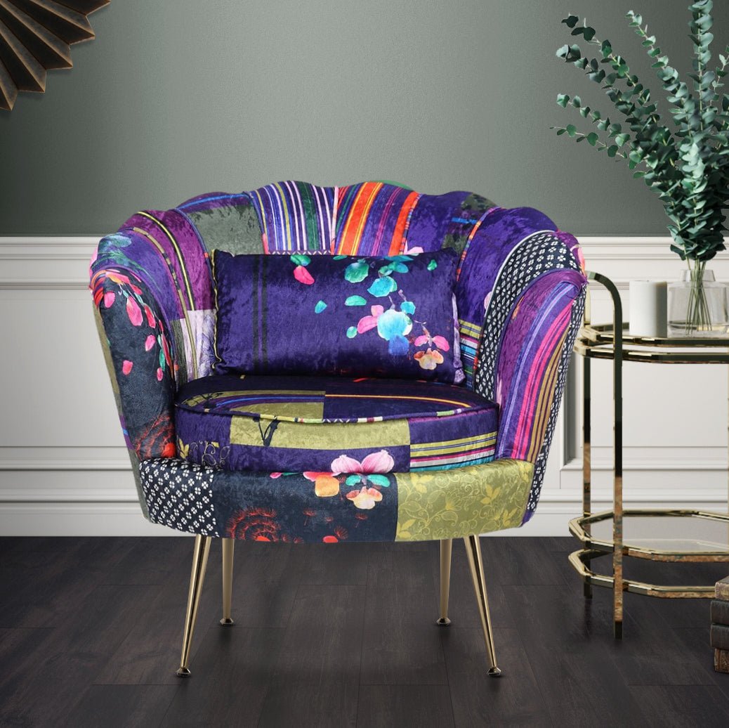 The Fabric Patchwork 1 Seater Daisy Sofa is a must-have for anyone who wants to add a touch of bold elegance to their home. With its scalloped back design, elegant gold legs, and unique Fabric Patchwork design, this chair is a true work of art. And with its durable construction and comfortable cushion, it’s as functional as it is stylish.